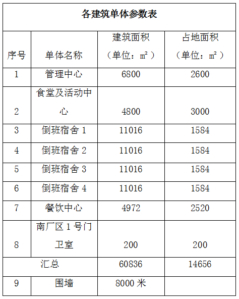4、采購項目內容包括:管理中心、食堂及活動中心、倒班宿舍(暫定四棟)、餐飲中心、南廠區(qū)門衛(wèi)室、圍墻立面概念設計,各單體參數(shù)如下表: